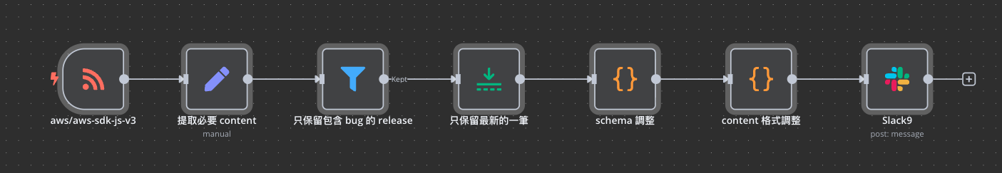 透過 n8n 自動化追蹤開發工具與依賴的最新版本更新,偵測包含 Bug Fix 的 Release,並自動發送 Slack 通知。文章包含實際 workflow JSON、程式碼節點正則處理與自動化邏輯設計。